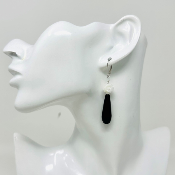 Cercei de 4.5 cm lungime din pietre de onix în formă de picătură de 2.5 cm combinați cu tandafiri mici sculptați din sidef natural. Pietrele sunt montate pe fir de sârmă de argint cu tortițe de argint.