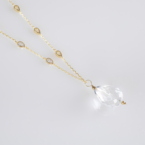 Colier de argint aurit de 42 cm ( fără lanțul de prelungire) decorat cu 6 cristale și pandantiv central din cuarț transparent în formă de picătură.