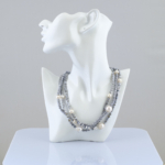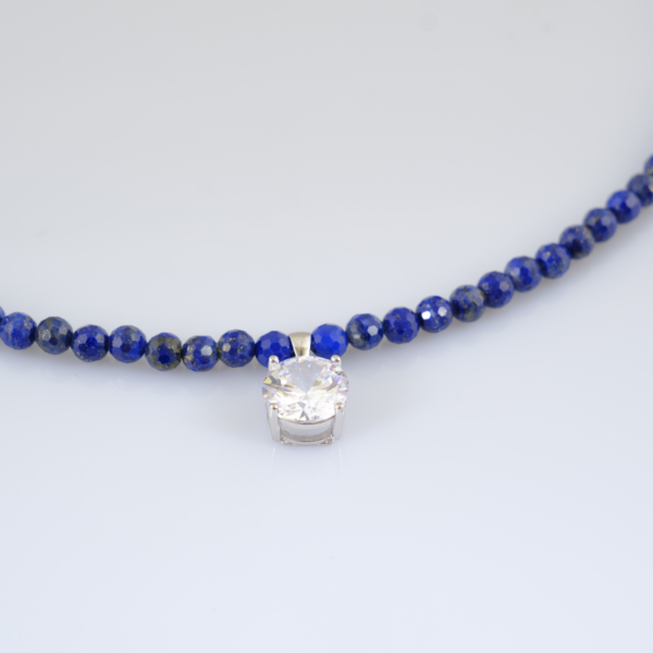 Colier de 42.5 cm lungime dintr-un singur șirag de pietre fatetate de lapis lazuli de 6 mm mm cu charm central mare decorat de 1,3 cm cu piatră de zirconiu. Pietrele sunt montate pe fir de oțel siliconat cu accesorii și închizătoare de inox.