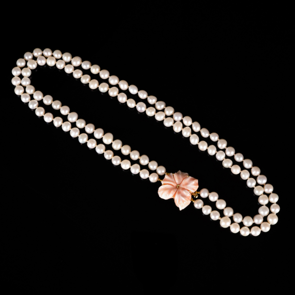 Colier dublu de 47 cm lungime din două șiraguri de perle albe de 8-9 mm cu închizătoare dublă de argint aurit/accesoriu decorat cu coral roz sculptat. Perlele sunt înnodate individual pe fir de ață. 2.8/3