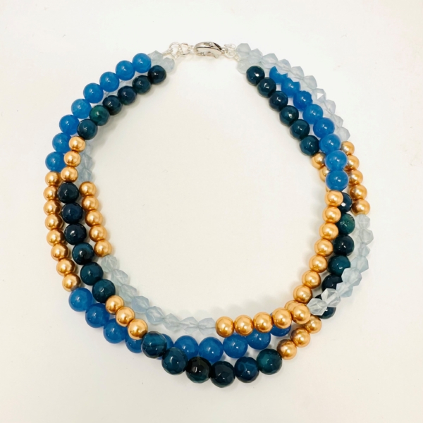 Colier unicat de 45 cm din trei șiraguri, două din pietre de jad albastru de nuanțe diferite și unul din agat albastru închis combinate în blocuri de culoare cu perle aurii artificiale. Pietrele sunt montate pe fir de oțel siliconat cu accesorii și închizătoare de argint.